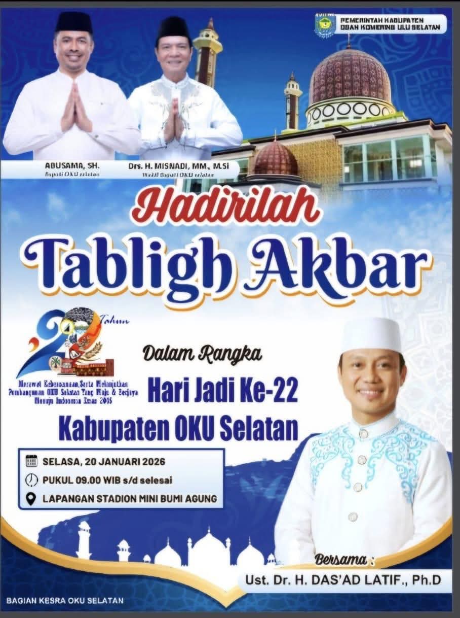 MUARADUA – Dalam rangka menyambut Hari Ulang Tahun ke-22 Kabupaten Ogan Komering Ulu Selatan (OKU Selatan), sebuah acara Tabligh Akbar istimewa akan digelar pada Selasa, 20 Januari 2026, di Lapangan Stadion Mini Bumi Agung. Kegiatan ini dimulai pada pukul 09.00 WIB dan akan berlangsung hingga selesai.
